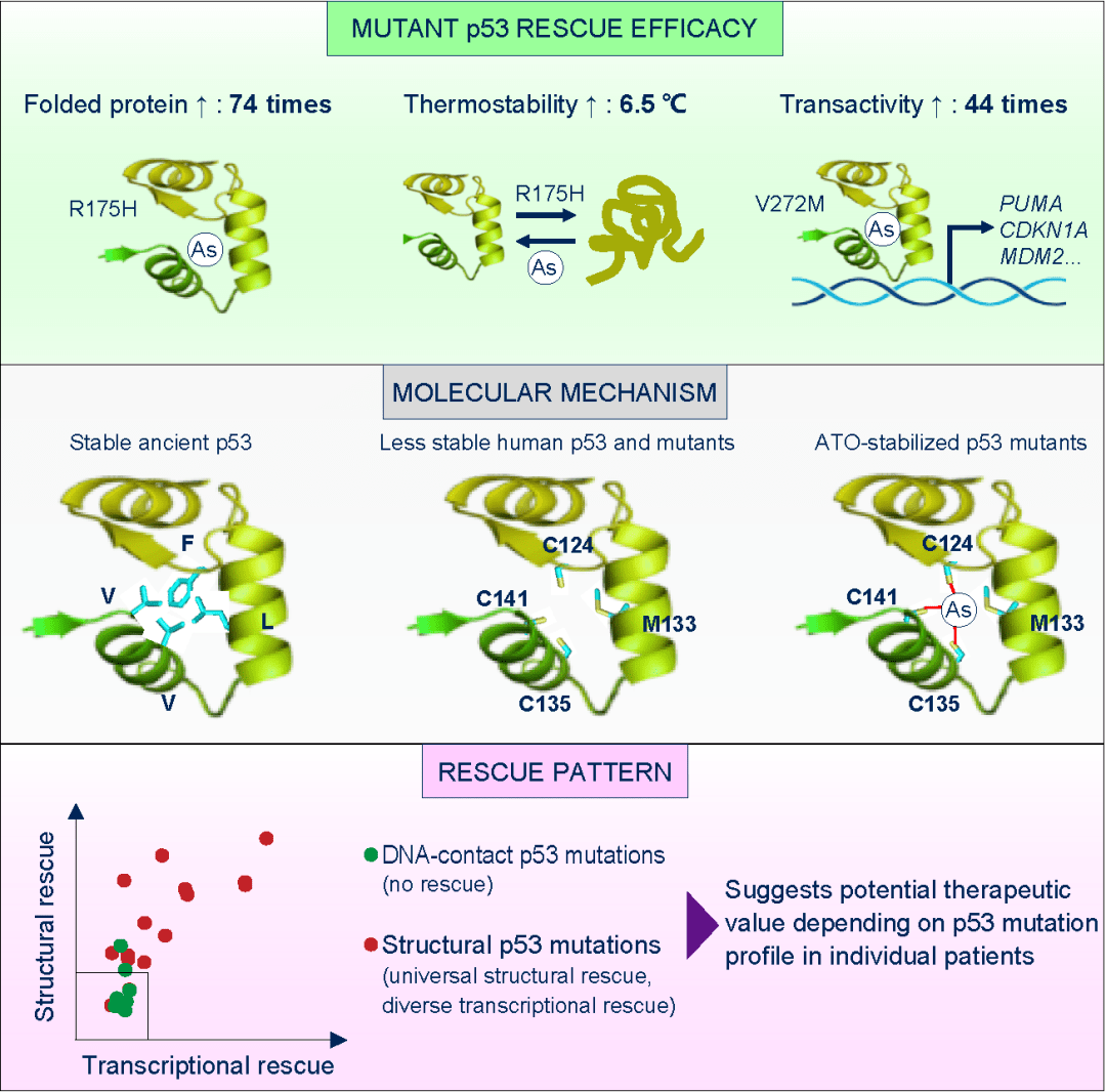 然而,總體而言,ATO在非APL白血病上的臨床緩解率低。發(fā)現(xiàn)APL特有的PML-RAR以外的ATO作用靶點(diǎn),正確選擇可能取得療效的病人,是實(shí)現(xiàn)ATO“老藥新用”的重要環(huán)節(jié)。近日,上海交通大學(xué)醫(yī)學(xué)院附屬瑞金醫(yī)院 盧敏研究員等發(fā)表在 Cancer Cell 上的工作揭示ATO可直接靶向結(jié)構(gòu)突變型p53,促使這一類蛋白更容易折疊并恢復(fù)其抑癌功能。該研究顯示, 相比于已經(jīng)報(bào)道的p53靶向化合物低下或者難以檢測(cè)的p53復(fù)活效率,ATO在復(fù)活p53效率上具有一到多個(gè)數(shù)量級(jí)上的優(yōu)勢(shì),并具明確的p53突變適用譜,即誘導(dǎo)p53不折疊的那一類“結(jié)構(gòu)型突變”。