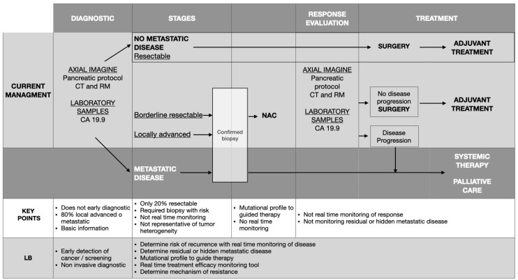 血清標(biāo)志物碳水化合物抗原19-9(CA19-9)和增強(qiáng)計(jì)算機(jī)斷層掃描(CT)是診斷和監(jiān)測(cè)反復(fù)的主要方法。然而,CA19-9在敏感性和特異性方面均存在局限性(約80%和約75%),并且并非僅限于胰腺癌。另一方面,CT掃描主要檢測(cè)宏觀疾病反復(fù),適用性有限。此外,使用實(shí)體活檢進(jìn)行組織學(xué)分析存在報(bào)告的局限性和風(fēng)險(xiǎn)。